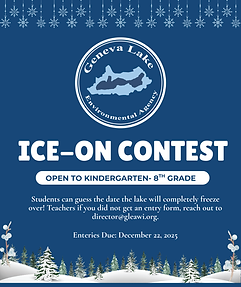 Geneva Lake is a large, deep lake—7.6 miles long, with 20.2 miles of shoreline, and reaching 140 feet at its deepest point. It’s the second deepest natural lake in Wisconsin, which means it often takes longer to completely freeze than many other lakes in our area. For any lake to freeze, temperatures must remain below 32°F (0°C) for an extended stretch of time. While Geneva Lake usually does completely freeze, there have been a few winters when it did not. Since record-keeping began in 1862, the lake has frozen as early as November 23 and as late as March 10, with every date in between occurring at least once. If you think the lake won’t completely freeze this winter, you may write no freeze on the entry form. Please remind students: Always check with a trusted adult before going onto any ice to make sure conditions are safe.