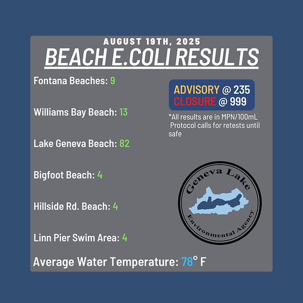 GLEA monitors E. coli bacteria levels at public beaches around Geneva Lake by collecting water samples every Monday during the summer. These levels help indicate the potential presence of harmful germs. Results are shared with local municipalities and posted on GLEA’s Facebook, Instagram, and website page (www.gleawi.org) within 24 hours. While these tests provide a helpful snapshot of water quality, conditions can change quickly due to weather, wildlife, runoff, or wave activity. One area may test clear, while another nearby area may contain higher levels of bacteria. GLEA posts counts taken from 1–3 sample points at each beach location. If levels are high, GLEA retests until levels are within EPA standards and continues to post updates to the public.